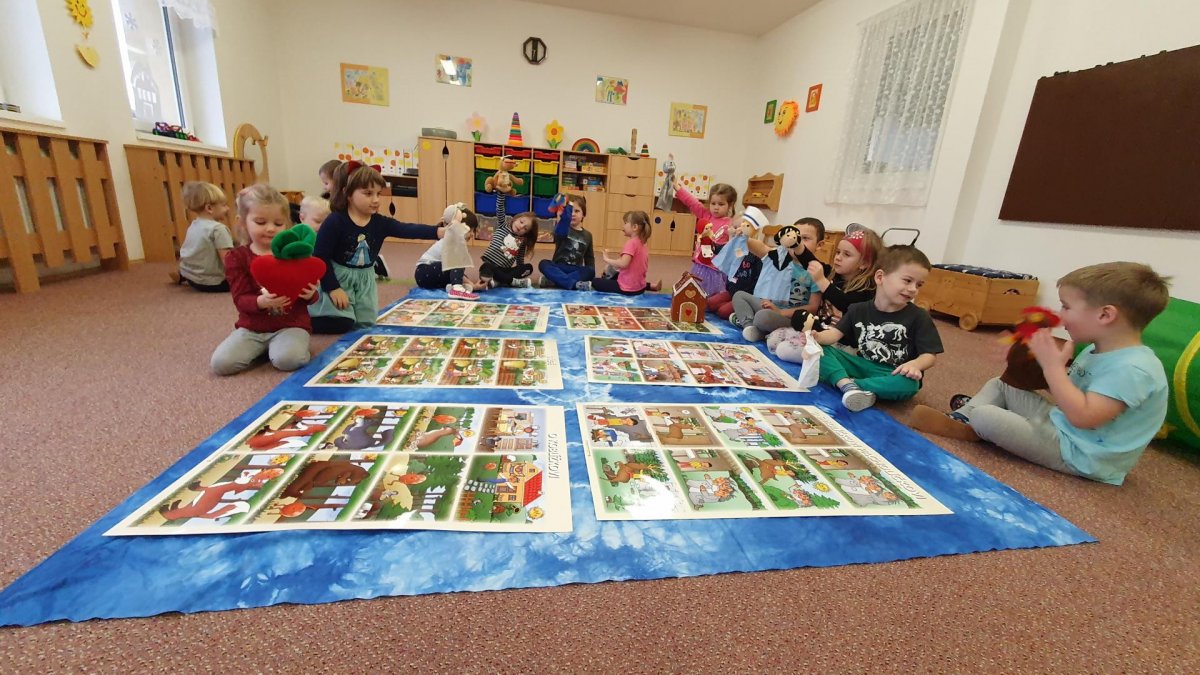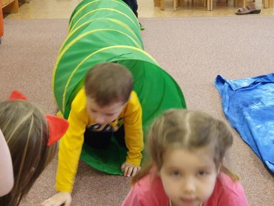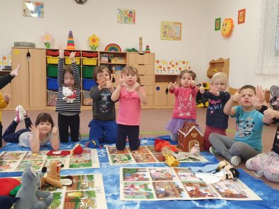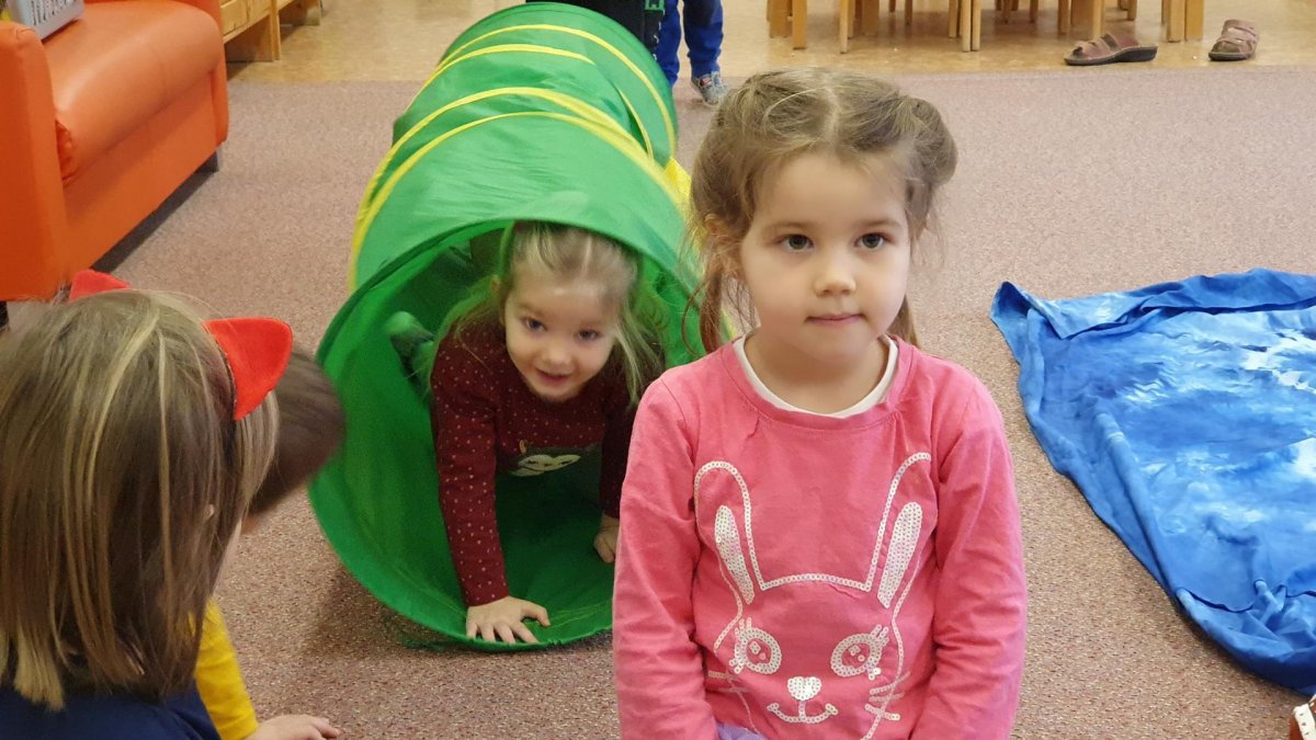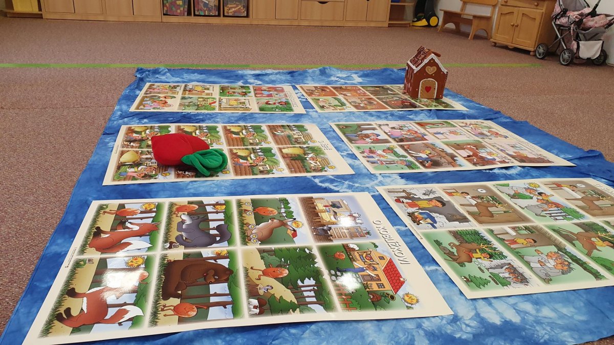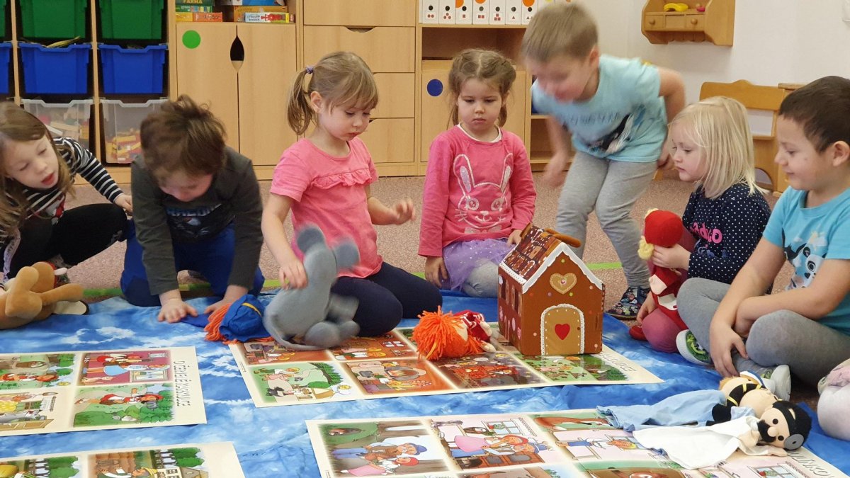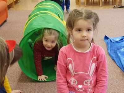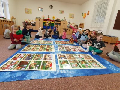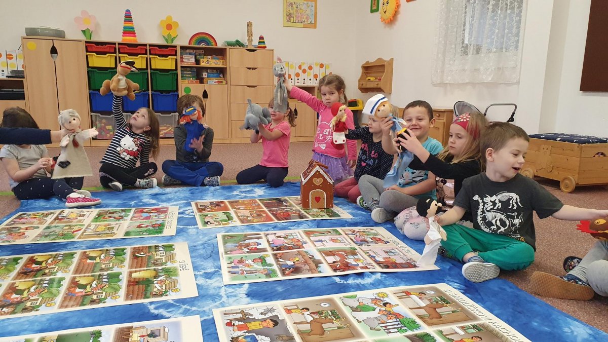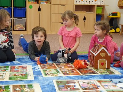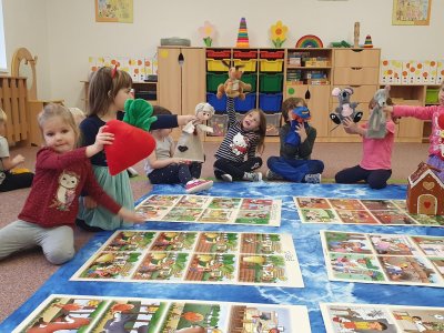 Celý týden se věnujeme pohádkám a pohádkovým bytostem. Prolezli jsme kouzelným tunelem do pohádkové říše. Zkoušíme poznat večerníčky podle znělky, hledáme pohádkové dvojice, přiřazujeme postavy k pohádkam, pohádkové obrázky řadíme podle dějové posloupnosti, zpíváme písničky z pohádek, opravujeme kašpárka, který plete pohádky, sami pohádky i hrajeme. Moc se nám to líbí a užívame si to.