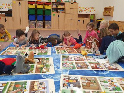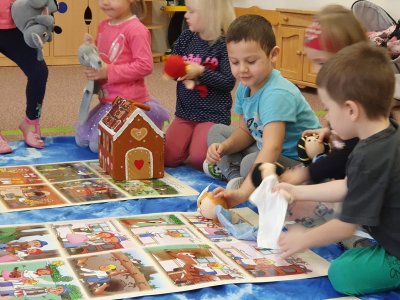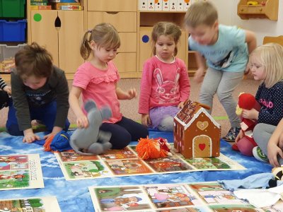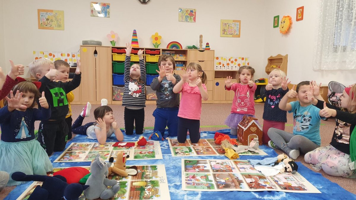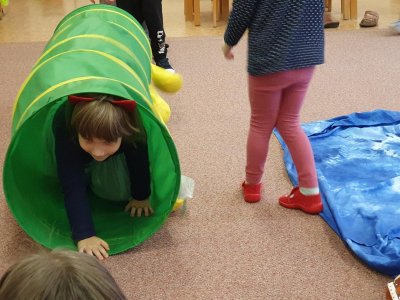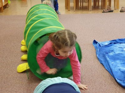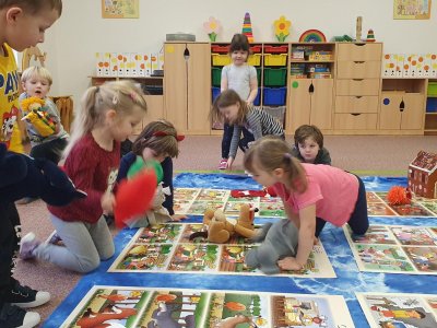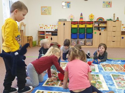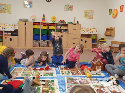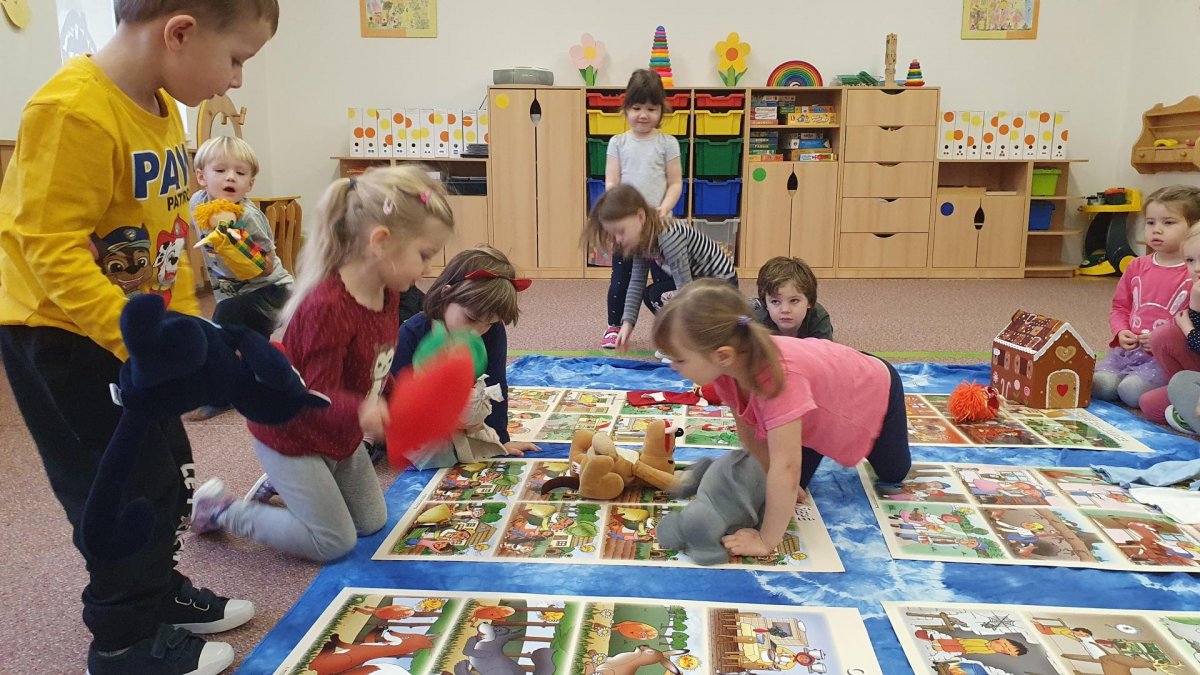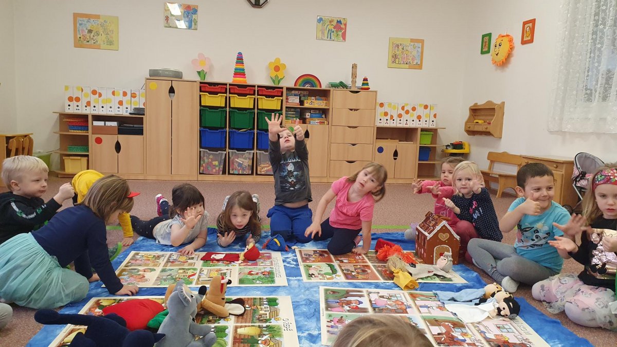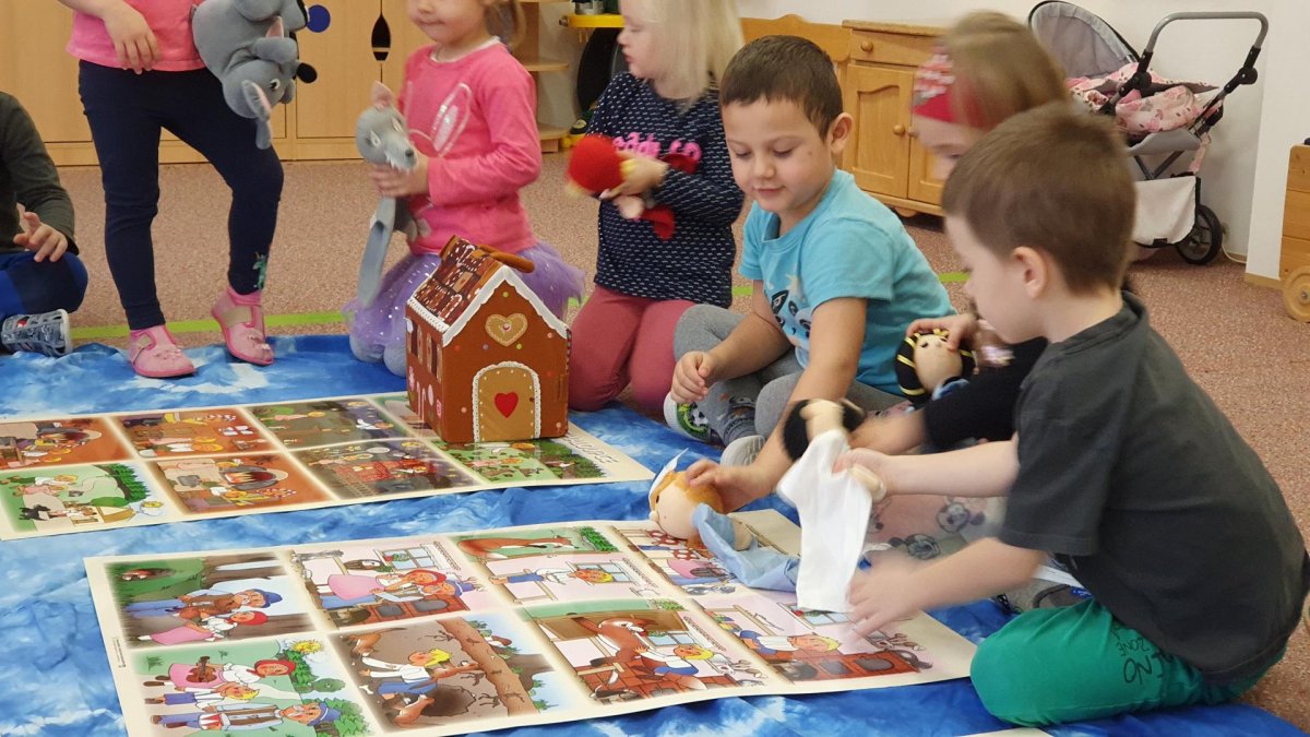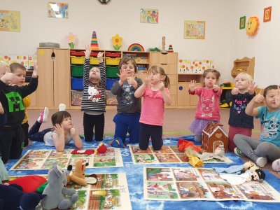 Celý týden se věnujeme pohádkám a pohádkovým bytostem. Prolezli jsme kouzelným tunelem do pohádkové říše. Zkoušíme poznat večerníčky podle znělky, hledáme pohádkové dvojice, přiřazujeme postavy k pohádkam, pohádkové obrázky řadíme podle dějové posloupnosti, zpíváme písničky z pohádek, opravujeme kašpárka, který plete pohádky, sami pohádky i hrajeme. Moc se nám to líbí a užívame si to.