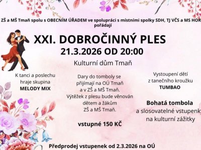 přijměte srdečné pozvání na XXI. Dobročinný ples, který se koná dne 21. 3. 2026 od 20h v KD Tmaň (Lístky na ples lze zakoupit v předprodeji spolu s rezervací míst na