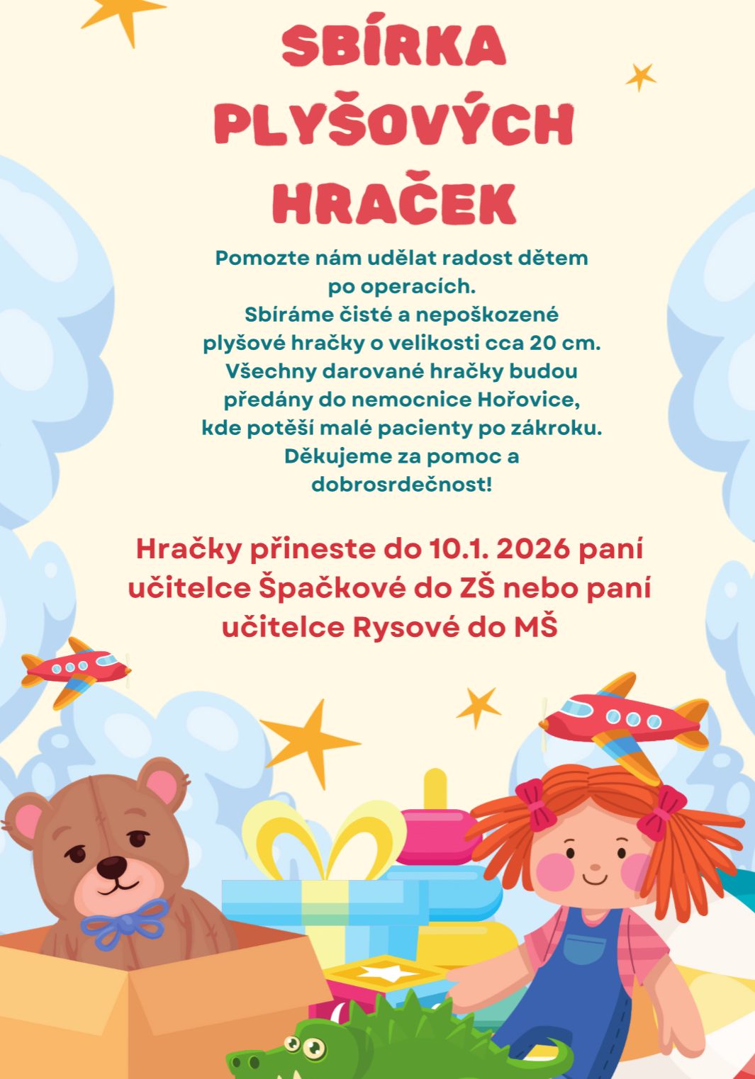 Naše škola se připojuje k projektu, který najde smysluplné využití pro mnohdy již nepotřebné plyšové hračky, ty nyní potěší malé pacienty během náročných chvil. Pojťe nám pomoci udělat dobrý skutek a předat radost tam, kde je nejvíce potřeba. Bližší informace v přiloženém letáčku.
