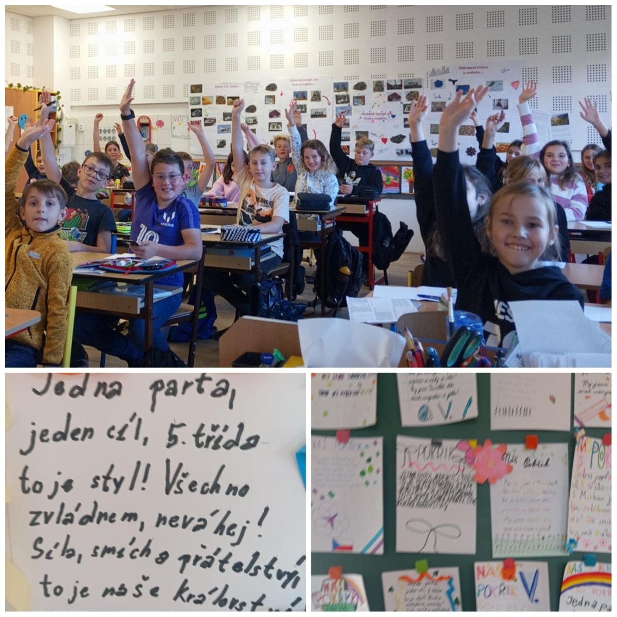 Jsme nejstaršími žáky na naší škole a je nás 30. Někdy to mezi námi jiskří, ale většinou jsme dobrá parta, proto jsme si uspořádali soutěž o nejlepší pokřik. Všechny návrhy jsme krásně výtvarně upravili a nakonec jsme si jeden společně zvolili.