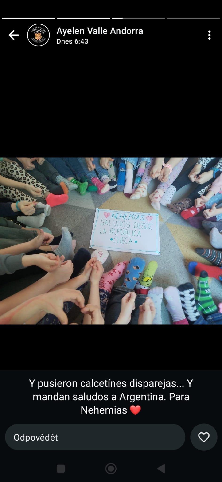 A jako bonus děti v rámci Ponožkového dne v družině poslali pozdrav klučinovi Nehemiasovi s Downovým syndromem do Argentiny. A od jeho maminky se nám dostalo milé zpětné vazby, kterou vzkaz dojal i potěšil.