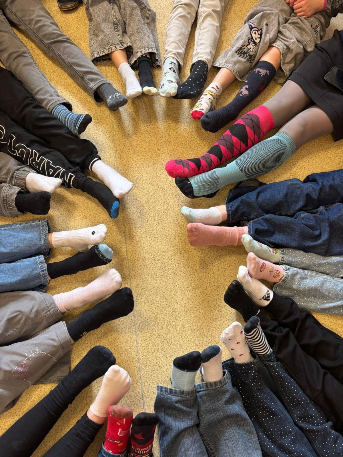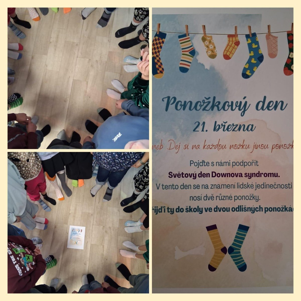 Symbolem tohoto dne jsou barevné ponožky, protože pod mikroskopem připomíná lidský chromozom svým tvarem ponožku a také proto, že nošením dvou různých ponožek můžeme dát najevo, že být odlišný je normální. Protože letos připadá tento den na sobotu, připomínáme si ho ve ŠD ve čtvrtek 19.3. a ve škole v pátek 20. 3., kdy si i my nasadíme na každou nožku jinou ponožku.