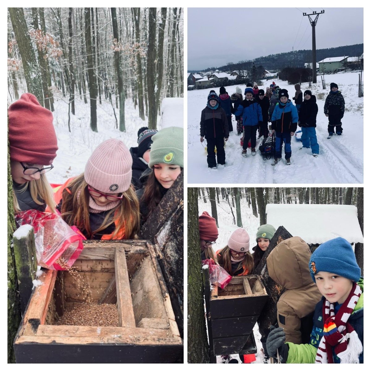 Se čtvrtou třídou jsme vyrazili do lesa nakrmit zvířata a doplnit krmítka. Cestou jsme si pověděli něco o tom, jak divokým zvířatům pomáháme hlavně v zimě, když obtížně hledají potravu. Výpravu jsme si navíc zpestřili bobováním na blízkém svahu, takže kromě dobrého skutku jsme si užili i spoustu zábavy na sněhu.